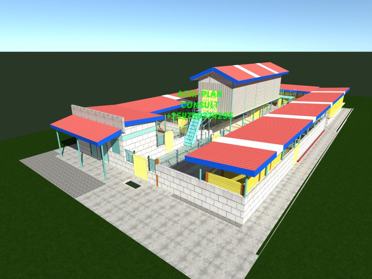 The product above is a detailed combined dairy cows and dairy goats unit plans and designed, Its fully detailed with all the essential sections plus the top store to store all the dry fodder.